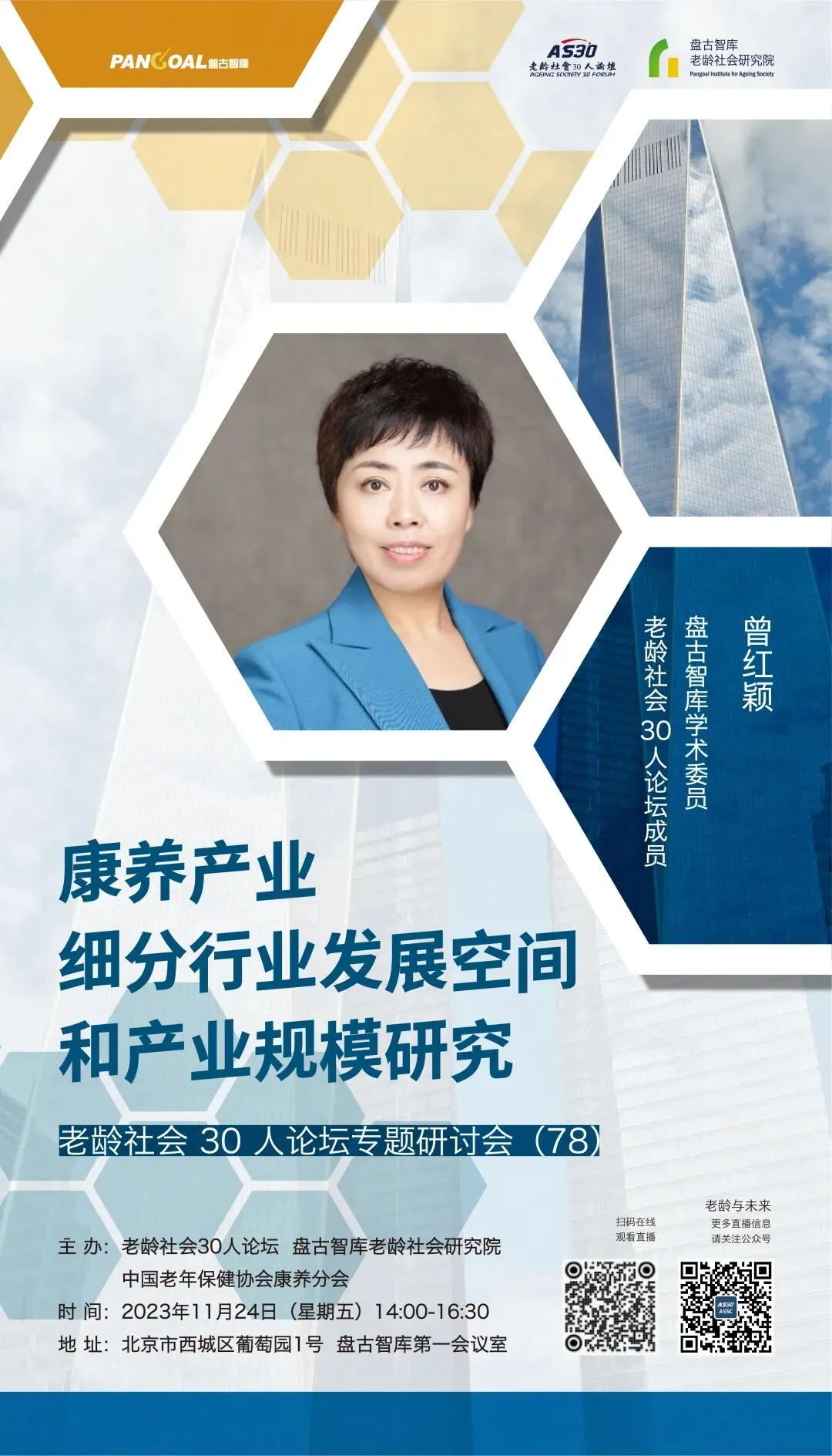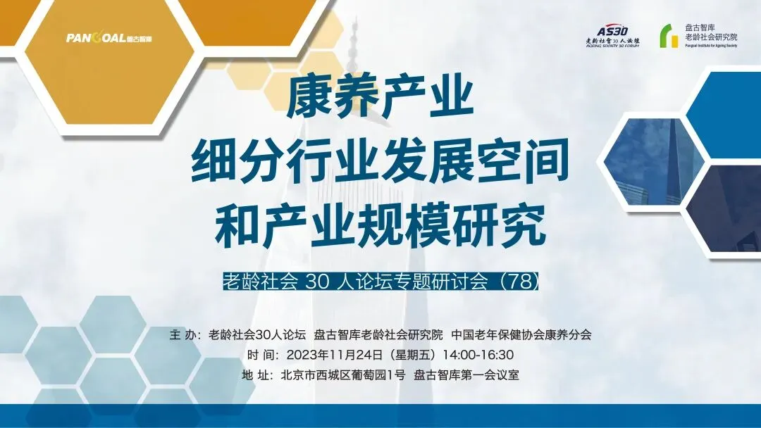 11月24日下午,由老龄社会30人论坛、盘古智库老龄社会研究院、陕西省黄陵县卫健局联合主办的“康养产业细分行业发展空间和产业规模研究”专题研讨会在京成功举办。本次研讨会邀请盘古智库学术委员、老龄社会30人论坛成员曾红颖主讲。凤凰网风直播、学说平台以及老龄与未来视频号同步直播,在线参与人数近15万。