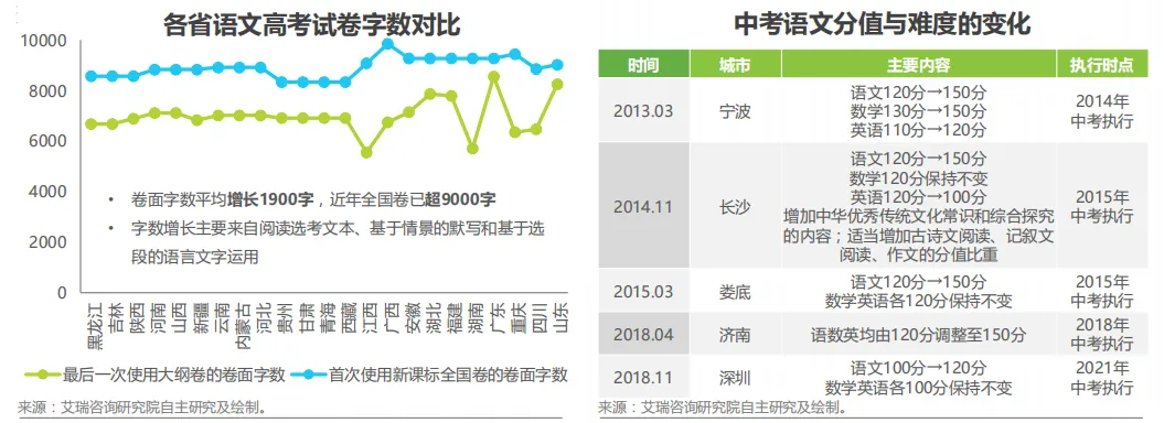 自2014年新高考改革开始,语文学科在考试评价体系中的权重得到提升。在高考指挥棒的影响下,部分地区的中考方案中,语文学科的考试分数与内容也有相应的改变。