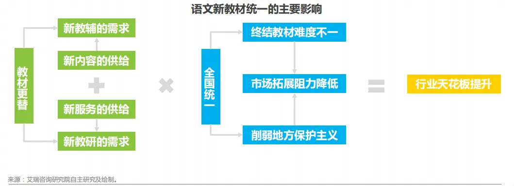 教材统一后,全国中小学生的语文教学内容与教学目标将实现统一,国家对中小学生语文教育的要求被拉到同一水平线上,教材难度不一的讨论将被终结。对于地方性的教育服务商而言,得益于地域间教材差异的消弭,地方教材保护主义被削弱,因缺失适配多教材版本的产品线而带来的市场拓展阻力不断降低,业务天花板将得到提升。与此同时,新老教材的更替往往意味着相应教辅资料与教研资源的更新,在“新”教材为市场带来新的需求的同时,校内外各类教育工作者的集体教研将为语文教育市场带来新的供给。