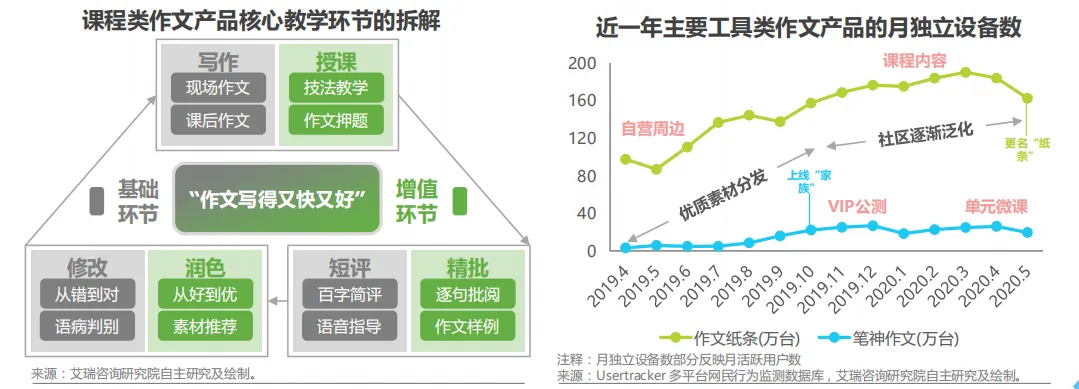 从工具类产品来看,获取精准而优质的写作素材是写作场景中的高频需求,个性化的素材聚类与分发成为工具类作文产品的引流功能,从内容分发到社区泛化,工具类产品正挖掘其第二增长曲线。