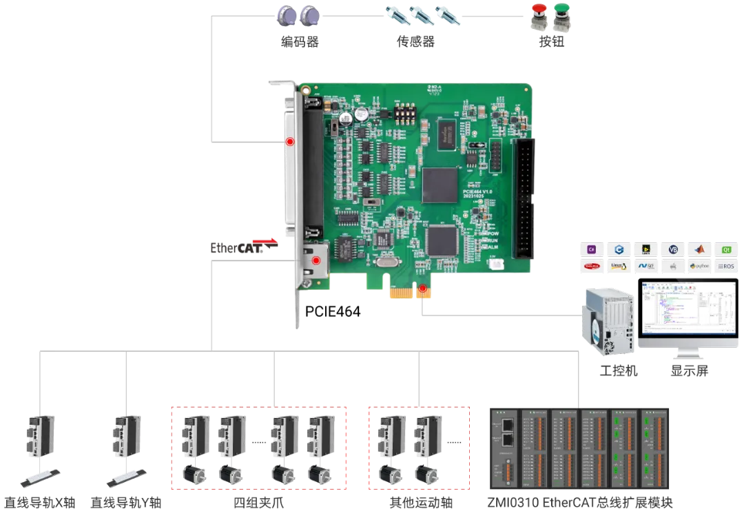 方案采用XY直线运动平台、传输装置、供料装置等组件,配备超高实时PCIe EtherCAT控制卡PCIE464,可实现多组工作头的同步控制和高速数据传输。