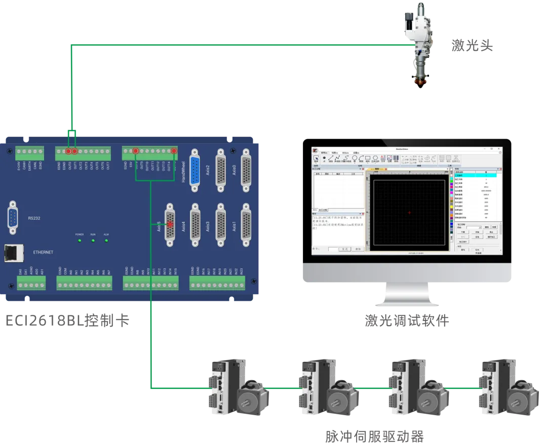 基于ECI2618BL激光加工控制系统主要用于金属切割、激光焊接等激光加工过程中,控制伺服电机来实现光纤激光头的移动,广泛应用于需要高速移动的光纤激光加工场合。能够实现大范围的移动,适合切割与焊接的加工。