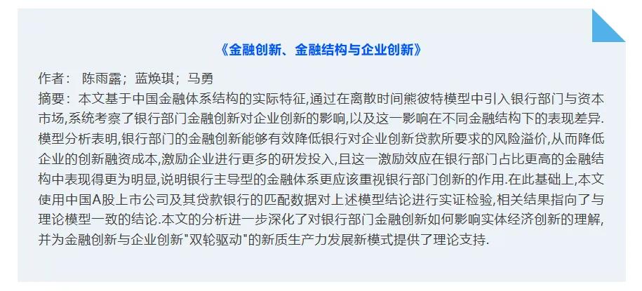 本文将“银行部门金融创新”定义为银行在信贷产品设计、风险评估模型、信息处理技术等方面的制度与工具革新,其核心作用机制是降低对企业创新贷款的风险溢价。通过引入离散时间熊彼特模型并嵌入银行与资本市场双轨结构,文章揭示了银行创新能有效缓解信息不对称和抵押不足问题,从而降低企业研发融资成本。尤其在银行主导型金融体系中,这一激励效应更为显著。该变量的独特性在于它跳出了传统“资本市场 vs 银行”的二元对立,强调银行自身创新能力的内生价值,挑战了“直接融资优于间接融资”的主流认知。