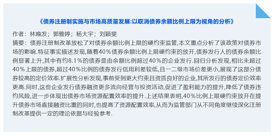 原规定企业债券余额不得超过净资产的40%,构成硬性约束。本文以该政策松绑为自然实验,发现放宽后优质企业融资能力增强,信用利差下降,定价效率提高,违约风险降低。这表明适度放松数量型监管可提升市场资源配置效率,体现注册制“信息披露为核心”的改革逻辑。该变量体现了从“审批制”向“市场决定”的范式转变。