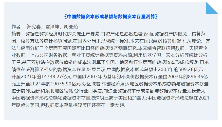 “数据资本存量”是指经过加工、整合、可用作生产要素的数据资产的历史累计净值,采用永续盘存法核算。本文首次构建了符合SNA(国民账户体系)框架的中国数据资本测度体系,涵盖投入成本、折旧率、价格指数调整等关键参数,填补了我国数字经济核算中的基础性空白。该变量的意义在于将“数据”正式纳入资本范畴,使其可量化、可比较、可纳入GDP增长分解,为全要素生产率(TFP)测算提供新维度。