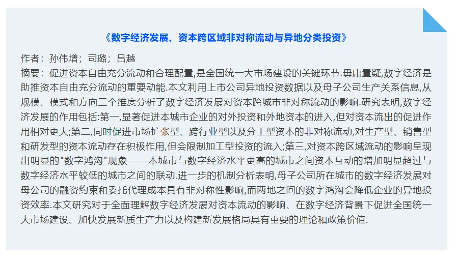 该变量指企业在不同城市间投资的流入与流出存在结构性差异,尤其是数字经济背景下,“数字鸿沟”导致资本更多流向高数字化水平地区,形成“强者愈强”的集聚效应。文章区分了市场扩张型、分工型、加工型等多种投资类型,揭示了数字经济既促进又扭曲资本配置的双重角色。这一变量突破了传统资本流动研究的对称假设,突出了地理—数字双重空间下的资源配置不均衡性。