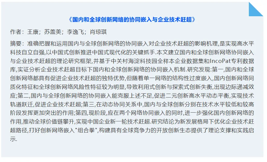 该变量强调企业不能仅依赖单一网络(国内或全球),而应实现双网协同嵌入——即同时参与本土产学研合作与国际技术联盟,在知识多样性与控制权之间取得平衡。研究表明,协同嵌入可避免“同质化陷阱”与“外部依赖风险”,推动利用式与探索式创新的动态平衡。这是对“开放式创新”理论的重要深化,提出了“结构互补性”作为技术跃迁的关键条件。、