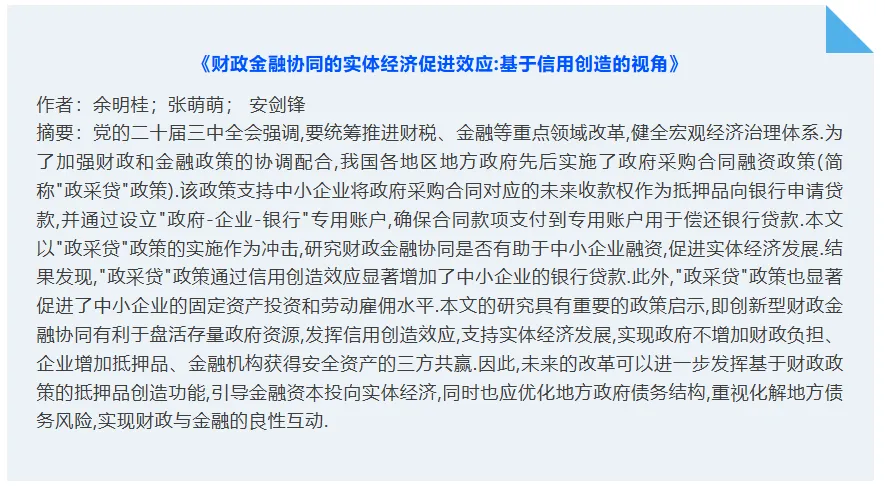 “政采贷”政策的本质是财政资源转化为金融信用:政府合同本身不具备货币属性,但通过专用账户闭环管理,使其成为安全抵押品,银行据此发放贷款,实现了无财政支出前提下的信用扩张。这种“财政赋能金融→金融服务实体”的机制,是一种典型的非赤字型财政金融协同创新。该变量重新定义了财政政策的作用边界,拓展了宏观调控工具箱。