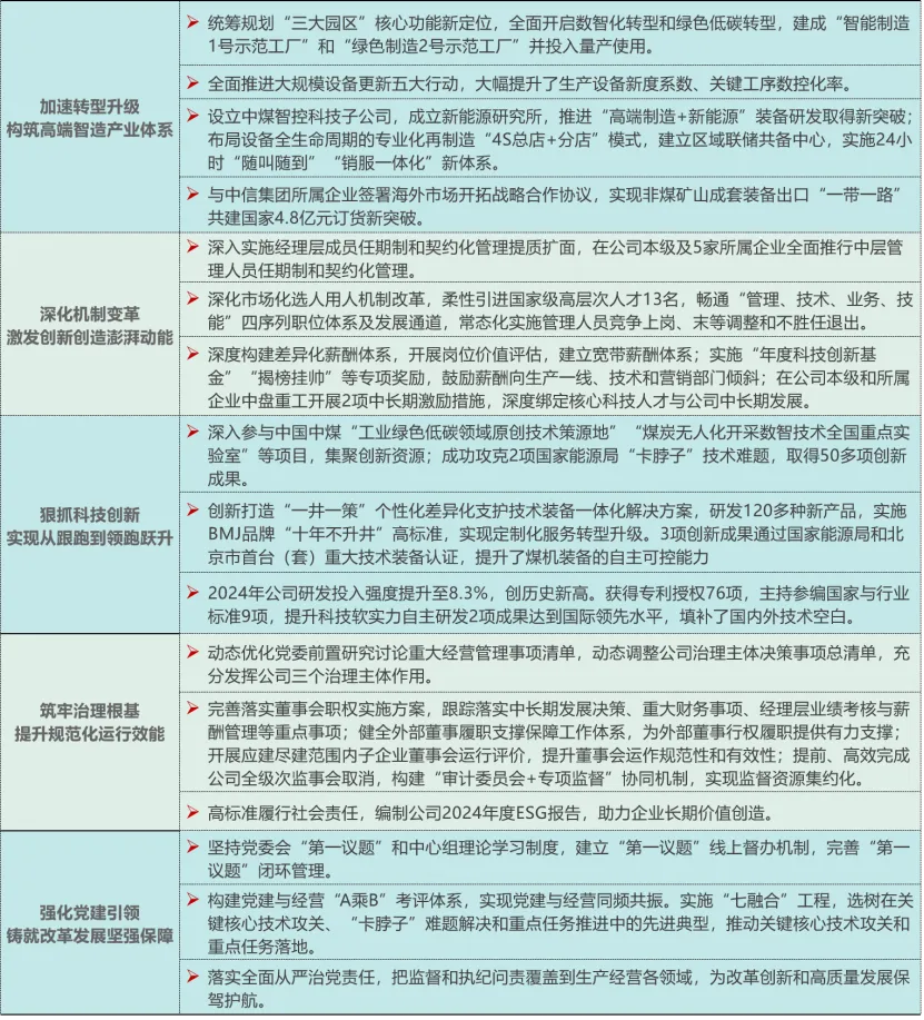 通过加大科技创新、产业转型升级、市场化经营机制改革力度,北煤机公司全力推动产业实力、创新能力、管理效能取得新突破。2024年获评科改“标杆”,经营利润同比增长25%,中高端产品占比超85%,国际业务同比增长4倍,连续获评“国家绿色工厂”“制造业单项冠军”和“北京市产业链龙头企业”。