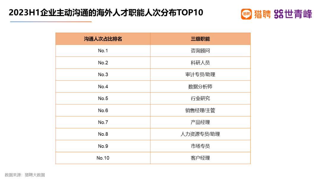 近日,猎聘与中国世界青年峰会联合发布了《2023海外留学人才就业发展报告》,其中对海外人才就业机会做了重点分析,包括“海外人才优先职位”分布最多的城市、行业和薪资情况,以及企业感兴趣的海外人才背景等信息。
