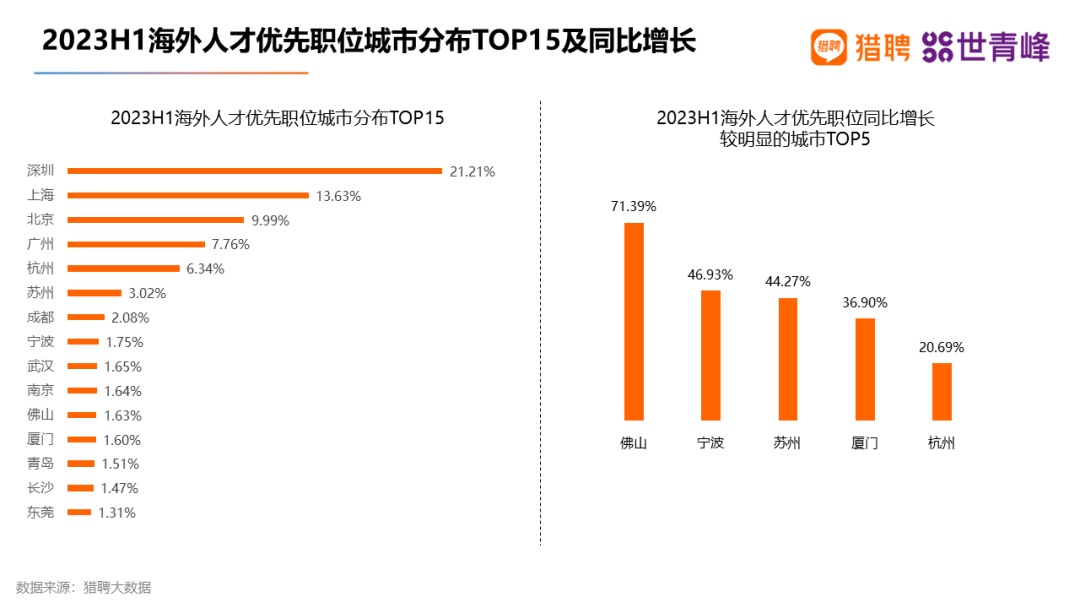 2)佛山、宁波、苏州海外人才优先职位同比增长位居前三,均超40%