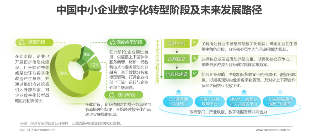 根据中国电子技术标准化研究院《中小企业数字化转型分析报告(2022发布)》,我国79%的中小企业仍在数字化转型探索阶段,12%的中小企业处于数字化转型践行阶段,而处于数字化转型深度应用阶段的中小企业仅占9%,2021年同比数据分别为89%、8%、3%。我国中小企业数字化水平稳步提升,但整体仍处在初期阶段。中小企业数字化之路道阻且长,究其原因,首先从内部因素来看,中小企业通常处于供应链中的一环,承担供货、代工、分销等单一角色,相比大型企业,缺乏较强的数字化转型内生需求,其营收水平也不足以支撑完整的数字化改造;从外部因素来看,由于我国工业化进程整体落后于西方发达国家,处在第三次工业革命与工业4.0并行发展阶段,产业结构与形态尚未成熟,无论是生产制造,还是流通、物流市场,都处在高度分散、碎片化的状态,中小企业信息化尚未普及,距离数字化升级还有较远距离。