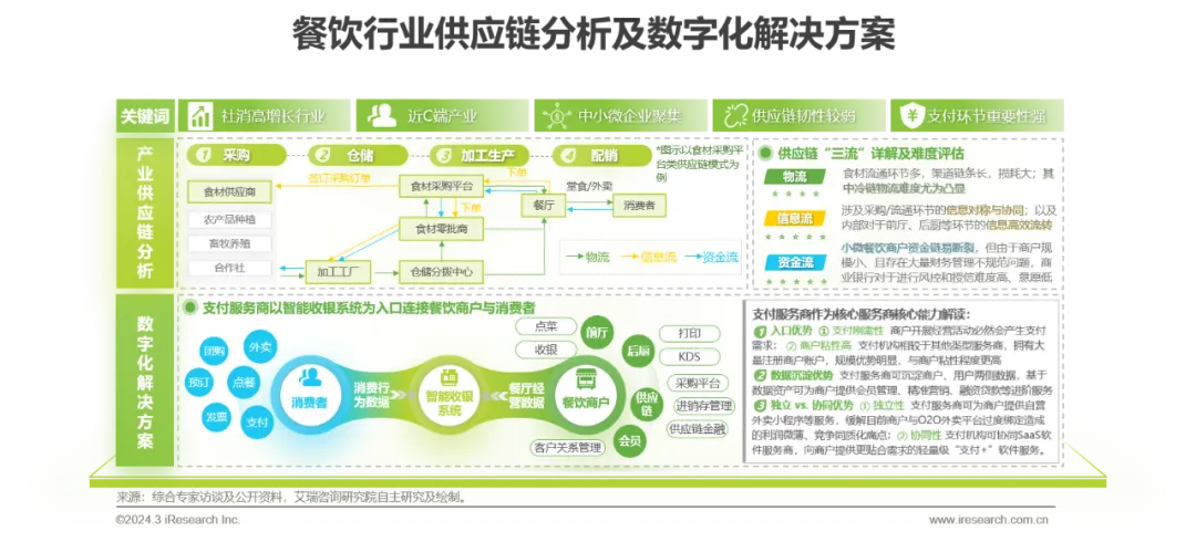 内部驱动力:餐饮业是典型的中小微商户聚集产业,普遍存在供应链抗风险能力弱、经营模式单一、忽视用户运营、货品供应效率低、融资渠道受阻等短板等问题,经营效益受到较大影响。近年来我国的餐饮企业供应链数字化升级服务已获得长足进展,其发展历程可以分为三个阶段, ① O2O平台服务商主导的“到家”类型供应链数字化升级服务;② 支付服务商由智能收款业务切入的“到店”类型供应链数字化升级服务;③ 由支付服务商主导的“到店”类型全链条供应链数字化服务。