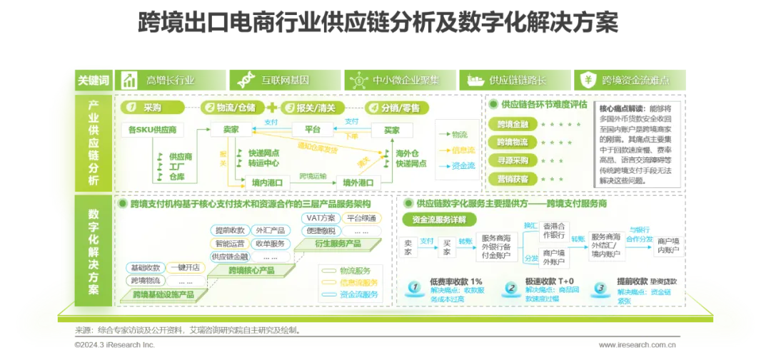 跨境出口电商依托境外电商平台,具备天然的互联网基因,信息化程度高,但由于涉及跨境运营,其突出痛点集中在跨境资金流与跨境物流的拉通;②跨境出口电商同样具有中小微企业聚集的产业生态结构,适合于数字化平台对产业进行整体性供应链数字化赋能,而非单点转型。针对行业特点,跨境支付服务商找准切入点,以资金流服务为核心,同时以“跨境支付+SaaS”、资源合作等模式,为跨境商户提供采购、物流、营销等端到端供应链数字化服务。