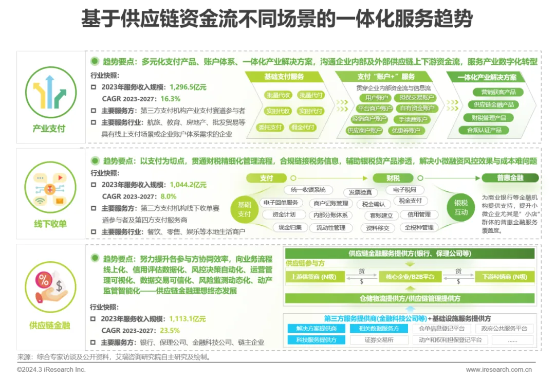 供应链数字化资金流服务是由传统金融机构和支付机构共同开展的,对于不同行业、不同体量的企业提供供应链金融、产业支付、线下收单等多种金融及支付服务。根据艾瑞统计测算,2023年中国供应链数字化资金流服务规模达到3454亿元,同比增速22.8%,不同场景的资金流服务均保持了较高水平增速。
