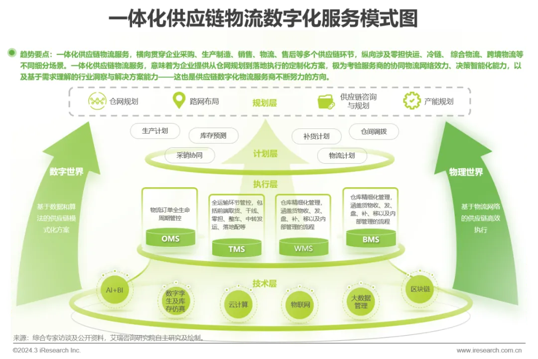 伴随着消费需求的多元化以及工业制造等领域对供应链上游的改造和效率提升,供应链数字化物流服务趋向进一步提质增效,与各产业融合发展进一步延伸:①精细化:第三方物流企业对于冷链物流、危化品运输、跨境运输及更多“小而专”的细分场景进一步深耕,以精细化物流方案服务个性化需求;②一体化:为客户提供完整供应链过程的一站式物流服务,不仅包括传统的货物运输、仓储和包装等环节,还涵盖供应链规划、配送网络优化、流程管理控制等多个方面等在内的全方位的物流解决方案;③智能化:将数智技术与基础物流服务相融合,不断提高物流管理过程的智能化和自动化水平,从而实现履约准确度、库存效率、存货周转效率的提升,并降低物流成本。