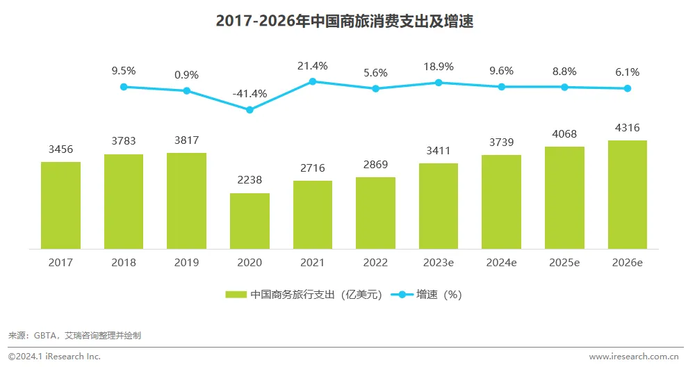 根据GBTA数据显示,随着疫情负面影响逐步得到缓解,中国商旅消费支出整体情况逐渐好转,2022年中国商旅消费支出达到2,869亿美元,预计2023年为3,411亿美元。此后中国商旅消费支出增长保持相对平稳状态,预计2024年基本恢复到疫情前水平,达到3,739亿美元,整体发展形势向好。