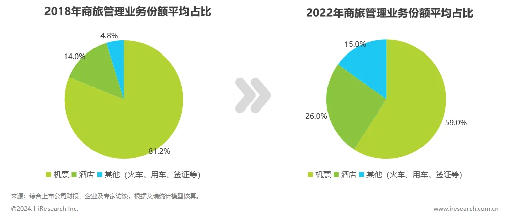 商旅管理行业业务范畴在不断得到优化,对比2018年和2022年的业务份额数据可以发现,机票虽仍是占比最高的部分,但份额上有所收缩,从81.2%下降至59%,相应酒店和其他业务比重有明显上升。究其原因,2022年受疫情等不确定性因素影响,人员跨区域流动受限和航司成本管控下执飞率降低导致的业务交易额下滑,直接大幅稀释了机票业务占比。但疫情严格防控期间企业员工长时/常驻出差情况的增加,使得酒店业务受到的冲击相对缓和。再叠加疫情期间火车出行更稳定可靠、员工选择率高的状况下,随着商旅管理行业全链路服务能力加强以及企业客户差旅产品个性化需求升级,商旅管理业务范围不断横向拓展,因此带来其他业务的提升,如火车、用车、签证、MICE等,其中火车及用车业务占比较高。即使业务结构在不断优化,但机票和酒店作为商旅管理支柱型业务,仍然占据压倒性优势地位。