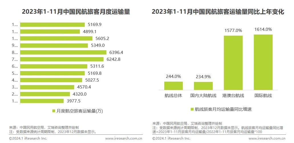 随着疫情防控政策不断优化调整以及国民经济稳定增长,国内民航运输市场开始回暖。2023年1-11月,中国民航月均旅客运输量为5,169.9万人,对比2019年同期月均旅客运输量5,519.3万人,即2023年前11个月已整体恢复至疫情前93.7%。参照上年同期数据来看,疫情期间高度压抑的旅行需求释放效果明显,三大航线旅客运输量均出现了不同程度快速增长,尤其是港澳台航线和国际航线更是实现了超过十五倍的大幅增长。