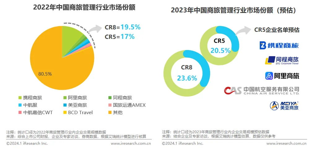 从行业竞争格局看,2022年国内商旅管理行业CR8为19.5%, CR5为17%,行业集中度仍然偏低。