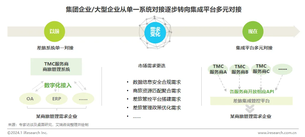 伴随全社会数字化转型的不断深入,国内企业对商旅管理数字化需求大幅提升,同时受客户企业降本增效提质以及数据安全管控推动,未来的商旅管理行业将从差旅系统搭建嵌入(如OA系统、ERP系统、HR系统、办公协同系统等)形成单一对接,逐步过渡到构建差旅集成管控平台实现多元对接。以此通过差旅服务供应商集中采购实现商旅资源匹配最优解,同时满足企业在信息安全、员工体验等方面的需求,并且这种模式在集团企业/大型企业中的需求表现尤为强烈。在此过程中,对TMC企业的数字化技术水平是不小的挑战,需要综合具备软件研发、接口开放、数据管理、信息安全、数据分析等多方面技术能力和创新能力,才能在激烈的市场竞争环境中建立差异化优势,稳固并扩大自身生存空间。