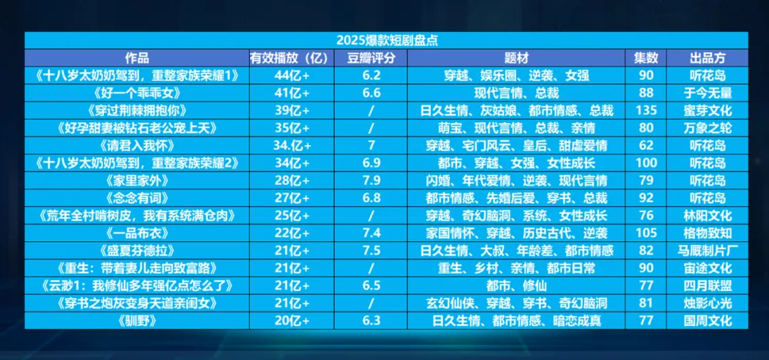2025 年,微短剧行业在短视频平台的流量加持下延续高增长态势,成为内容市场中最具活力的赛道之一。针对 15 部头部作品,其播放数据、题材分布与出品方格局,折射出当前微短剧的核心用户偏好,拆解微短剧的爆款逻辑、题材趋势与发展痛点,并展望行业未来方向。从盘点数据看,2025 年微短剧的流量虹吸效应显著:头部作品《十八岁太奶奶驾到,重整家族荣耀 1》以 44亿 + 有效播放登顶,TOP5 作品播放量均突破 35 亿 + ,而榜单尾部的《驯野》也达到20亿 + , 这一数据远超传统长剧的单剧播放量,印证了微短剧在碎片化场景下的流量吸附能力。短剧集数维度呈现“中长集微短剧”特征:15 部作品中,集数多集中在 60-100 集区间(如《请君入怀》62 集、《十八岁太奶奶驾到 2》100 集),最长的《穿过荆棘拥抱你》达 135 集。结合单集 1-3 分钟的时长,“短单集 + 多集数”的模式既适配碎片化追剧习惯,又能通过连续情节钩子维持用户粘性,实现“短平快”与“长留存”的平衡。1. 盘点作品的题材分布,清晰呈现出微短剧的“内容基本盘”与“创新试验田”:① 女频爽文:流量密码的核心叠加,女性向内容仍是绝对主流,核心元素集中在两大组合:穿越+ 逆袭 + 女强:以《十八岁太奶奶驾到》系列为代表,“穿越”快速建立冲突“女强 + 家族逆袭”满足情绪宣泄,第一季 44亿 + 播放直接推动第二季开发;② 总裁+ 言情 + 甜宠:覆盖《好一个乖乖女》《好甜妻被钻石老公宠上天》等作品,“总裁”标签击中女性情感期待,叠加“萌宝”“先婚后爱”强化甜宠属性。这些元素的叠加,本质是对女性用户“高效爽感”需求的精准匹配短时间内完成“低谷开局 - 逆袭反杀 - 情感圆满”闭环,让用户快速获得情绪价值。榜单中也出现跳出爽文框架的尝试:现实向《家里家外》以“闪婚 + 年代爱情 + 逆袭”贴近生活,收获 28亿 + 播放的同时,以7.9 分成为口碑 TOP1;家国情怀《一品布衣》融合“穿越 + 历史”聚焦大义,7.4 分体现用户对深度内容的认可;乡村题材《重生:带着妻儿走向致富路》以“重生 + 创业”切入下沉市场,填补题材空白 。这些作品说明,微短剧正从“单一爽感”向“多元情感共鸣”拓展,试图打破圈层固化。听花岛是最大赢家,5 部作品上榜(《十八岁太奶奶驾到 1/2》《请君入怀》《家里家外》《念念有词》),覆盖穿越、宅斗、现实等题材,播放量均跻身 TOP10。其逻辑是“主流 + 创新”双轨 。既持续输出爽文爆款,又布局《家里家外》等差异化内容,建立产能与用户认知的双重壁垒。- 蜜芽文化《穿过荆棘拥抱你》聚焦“日久生情 + 灰姑娘”,以 135 集维持粘性;