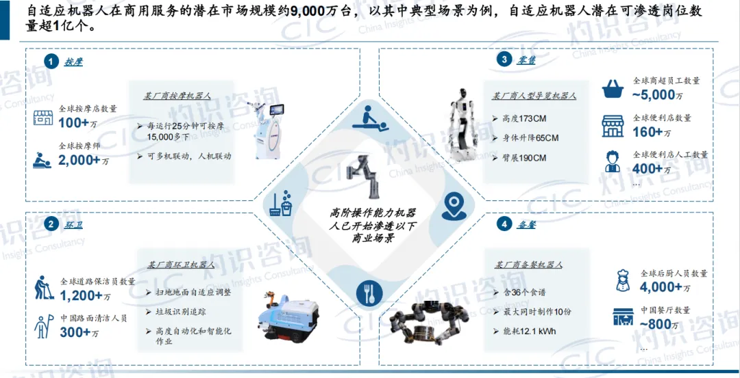 在消费电子(潜在1400万台):手机、电视的装配环节充斥着软排线插拔、精密螺丝拧紧、点胶等需要“手感”的工序,这正是自适应机器人的用武之地。 在汽车制造(潜在1000万台):线束安装、内饰件卡扣装配、柔性密封条贴合等传统上难以自动化的“细活”,有望被攻克。 在食品加工(潜在超1700万台):对形状大小各异的生鲜肉类进行标准化分割、去骨、包装,要求机器人具备处理柔性、易变形物体的能力。 在商业服务(潜在9000万台):备餐、按摩、清洁、零售,这些高度非标、需要与人或环境交互的场景,将成为自适应机器人未来的广阔天地。