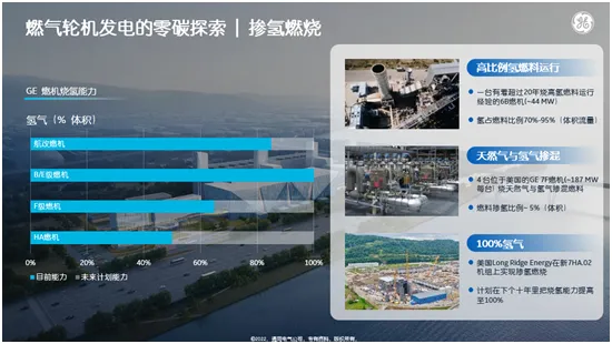 而于2021年1月投运的中国首个9HA.01燃气轮机电厂——天津华电军粮城电厂,自投运以来,电厂运行效率更是远超预期,联合循环效率达到63.36%,是目前国内投运的HA级燃机机组中效率最高的。对于如何进一步减少碳排放,白皮书中则建议,在有条件的地区支持率先开展燃气轮机掺氢示范或CCUS示范。“国家在今年年初出台了《氢能产业发展中长期规划(2021-2035年)》,这实际上打开了另一个窗口,如果氢能在技术上能够有所突破,形成规模效应并降低成本,那么氢可能会成为能源转型的一个长期技术,”GE燃气发电服务中国区总经理许欣对记者说,“燃气轮机掺氢燃烧不仅可以解决减碳的问题,也是解决能源安全的可行路径。”目前,GE在全球已有超过100台采用低热值含氢燃料机组在运行,累计运行小时数超过800万小时,其中部分机组的燃料含氢量超过50%。在中国,GE也已经有十几台燃烧高比例氢燃料的燃机在钢厂、化工厂运行。去年,广东省能源集团旗下的惠州大亚湾石化区综合能源站订购了两台套GE 9HA.01重型燃气轮机联合循环机组,2023年项目投产后,两台燃气轮机将采用10%(按体积计算)的氢气掺混比例与天然气混合燃烧,成为中国首座掺氢燃烧的9HA电厂。