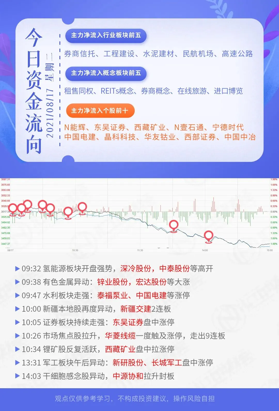 当然大家要明白,前一段时间实际上整个股指在3500上方反复进行震荡,它的本质还是在于消化上方的卖压,只不过在今天下挫的过程当中的,很多市场的情绪应该说,恐慌的情绪被释放了出来。因此来看的话也是有利于整体的股指在调整以后能够有更有力度的反弹,打下了一定的基础。而另外一边对于创业板来讲,同样在下探之后,应该说在切入到3300一带的强支撑的区域。同时整个在分时级别,创业板也已经连续出现了底背离的种状态。在伴随着今天极致的冰点产生,可以说整体市场的短期的反弹应该很快就会到来。再看到像恒生科技指数同样也已经重新回到了前期低点的附近,有支撑预期在的话,也将会促成反弹的到来。而另外,我们可以看到在市场调整的背景之下的,应该来讲有些板块确实是有被动调整的态势。接下来短期我们大家重点要留意的逆势抗跌,并且在反弹过程当中能够有迅速有力度反弹的品种,应该说大家重点聚焦的。对应的一些板块应该说还是低位转强以后。走成趋势加持的品种应该说当中会产生不少的后市活跃的个股。希望大家能够借着市场短期的一种快速的下探,好好把握低吸的机会,最后迎来反弹的拉高的行情。