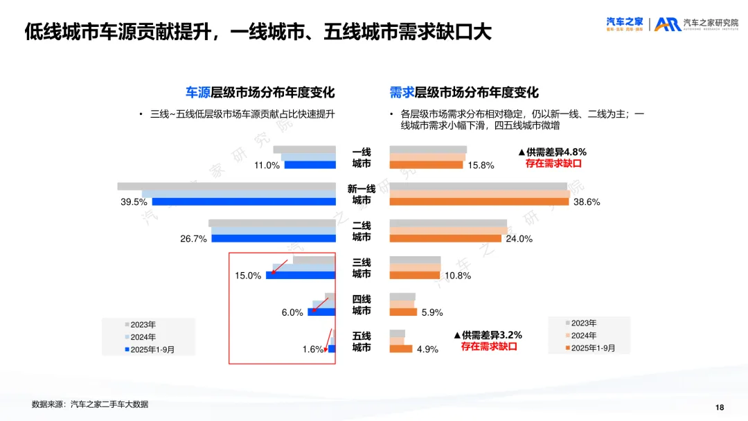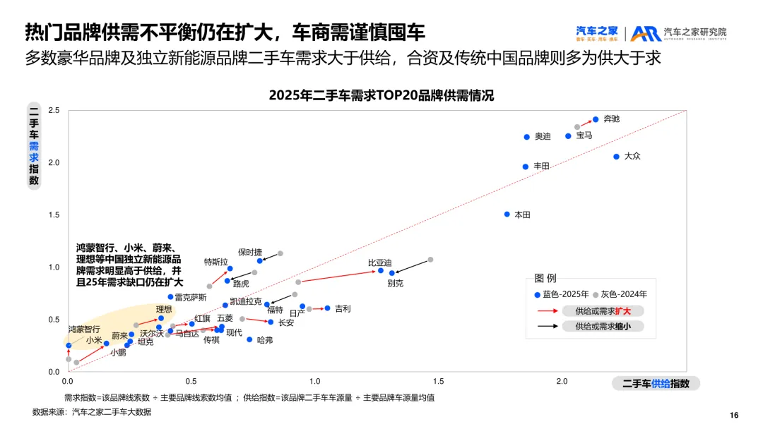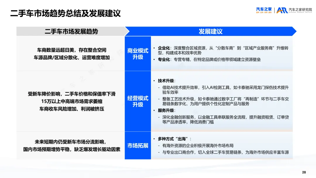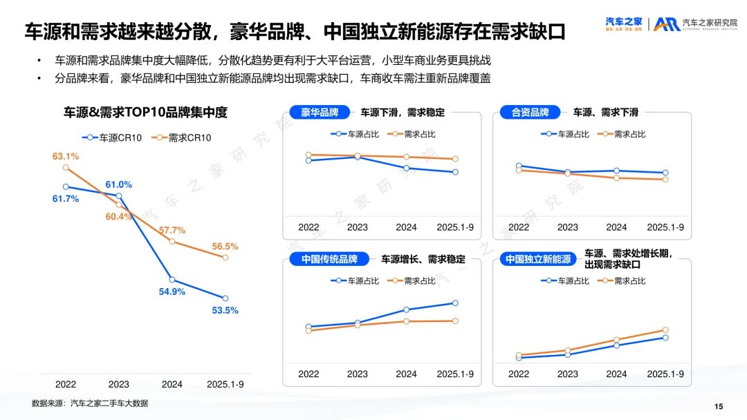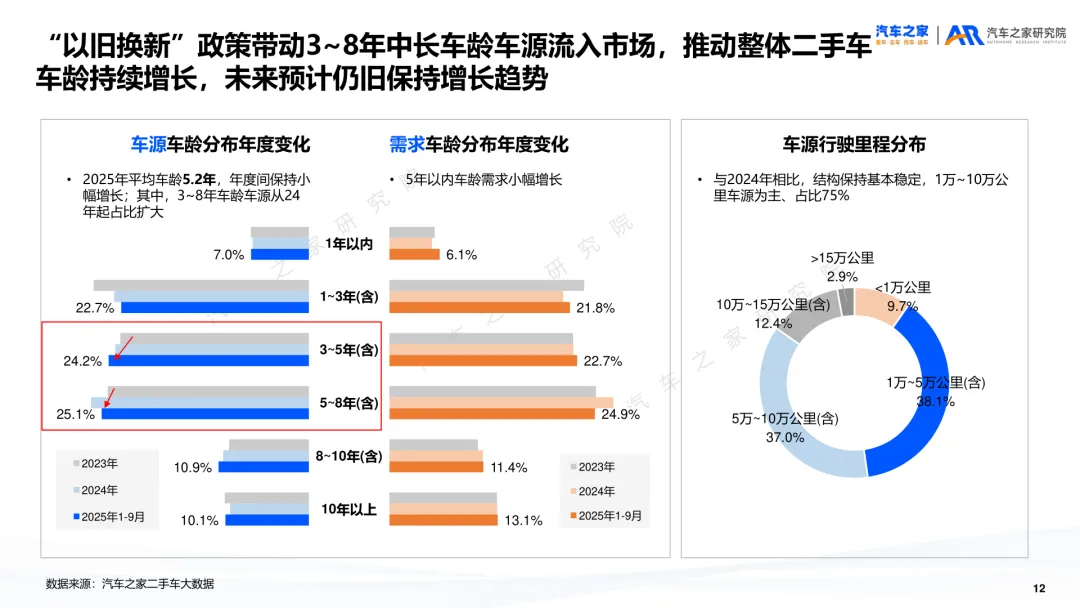 导读:报告聚焦二手车交易、供需及新能源细分市场动态,剖析行业发展特征与未来方向。二手车交易量增势放缓,受新车分流与价格波动影响,市场份额未获增长。近六成用户购车时兼顾新车与二手车,增换购人群对二手车接受度更高。车况不透明与交易不规范仍是用户选购主要顾虑,二手车价格同步新车下行,豪华品牌降幅最明显,保值率呈下滑趋势,新能源车型降幅大于燃油车。供需结构呈现多重变化,车源平均车龄增至 5.2 年,3-8 年车源占比扩大,15 万以下中低端市场成为供需主力。SUV 需求大型化趋势显著,中大型 SUV 及 MPV 存在供需缺口,品牌与区域分布更趋分散。新能源二手车占比不足 10%,线上需求活跃,价格带向 5-15 万元转移,品牌保值率分化明显,中国独立新能源品牌凭借插混 / 增程车型优势追平豪华品牌。