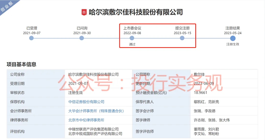 敷尔佳这个项目2021年9月7日受理,2022年9月8日上市委会议审议通过,但是直到2023年5月15日才提交注册,时隔9天获得证监会同意注册文件,不容易: