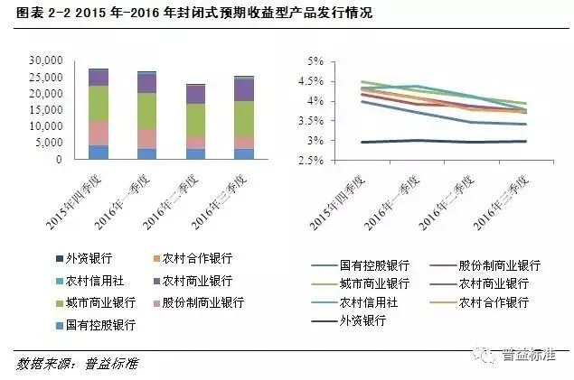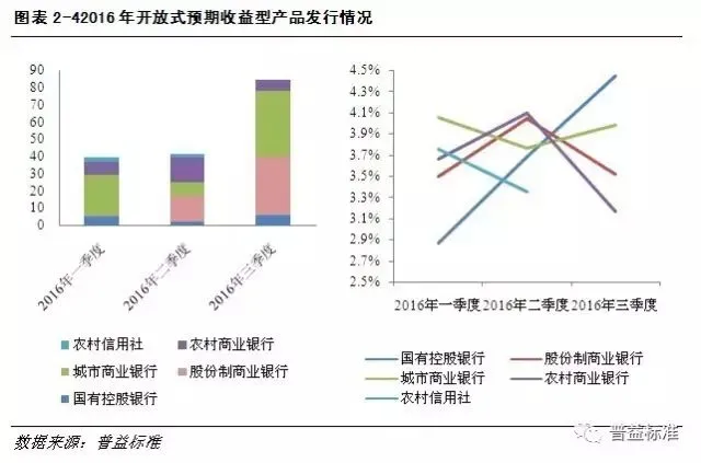 2016年一、二、三季度新发行的开放式预期收益型产品中,城市商业银行发行69款,平均收益率3.93%;股份制商业银行发行50款,平均收益率3.69%;农村商业银行28款,平均收益率3.64%;国有控股银行13款,平均收益率3.67%。可以看出由于资金端和竞争的压力,城市商业银行不仅发行数量最多,而且平均收益率最高。