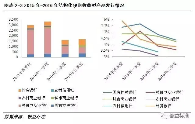 截止到2016年10月,结构化产品发行数量最多的为股份制商业银行,5973款;其次是外资银行,1693款;国有控股银行,1206款;城市商业银行,397款。收益率方面,国有控股银行5.04%,城市商业银行4.65%,外资银行4.53%,最低的反而是股份制商业银行,只有4.11%。造成这一现象的原因在于,近两年来股份制银行发行的结构化理财产品未达最高预期收益率的数量位列各类银行之首。面对这一短板,各银行对结构化理财产品进行了改造,加大该类产品风险控制,通过降低最高预期收益率的方法来降低风险。
