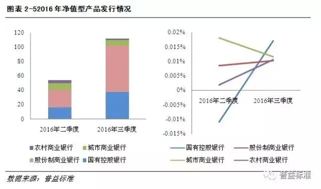 数据显示,2016年二、三季度股份制银行总计发行90款,占比54%,平均收益率(季化)为0.935%;国有控股银行发行53款,占比32%,平均收益率(季化)为0.305%;城市商业银行发行17款,占比10%,平均收益率(季化)为1.48%;农村商业银行发行6款,占比4%,平均收益率(季化)为0.625%。