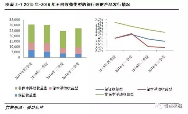 截止到2016年三季度,共发行保证收益型产品18494款,占比16.5%,平均收益率3.99%;保本浮动收益型产品27028款,占比24.1%,平均收益率3.78%;非保本浮动收益型66735款,占比59.4%,平均收益率4.67%。产品数量和平均收益率较2015年均出现下降。