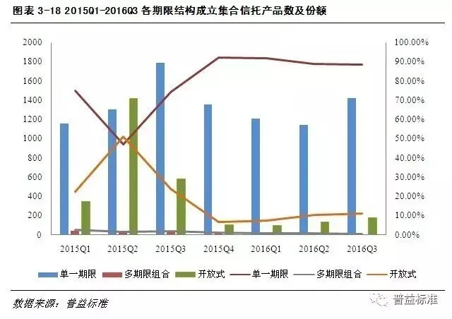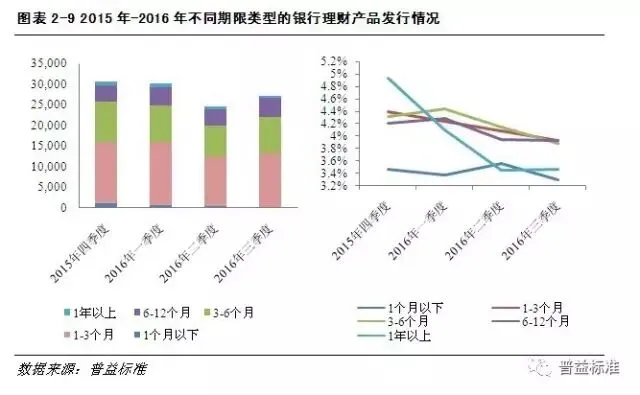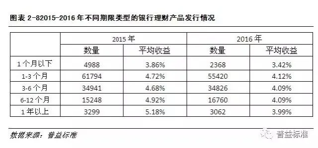 截止到2016年三季度,共发行期限为1个月以下产品2368款,平均收益率3.42%;期限为1-3个月产品55420款,平均收益率4.12%;期限为3-6个月产品34826款,平均收益率4.09%;期限为6-12个月产品16760款,平均收益率4.09%;期限为1年以上产品3062款,平均收益率3.99%。