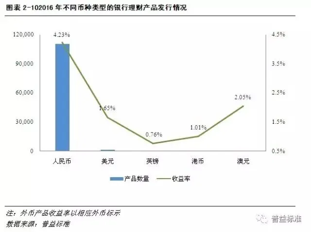 普益标准监测数据显示,2016年度发行的所有币种类型理财产品中人民币产品在数量上占据绝对的主导地位。具体来看,人民币理财产品本年共发行110537款,市场占比为98.67%,平均收益率为4.23%;美元理财产品本年共发行1075款,市场占比为0.96%,平均收益率为1.65%;澳元理财产品本年共发行210款,市场占比为0.19%,平均收益率为2.05%;港币理财产品本年共发行121款,市场占比为0.11%,平均收益率为1.01%;英镑理财产品本年共发行82款,市场占比为0.07%,平均收益率为0.76%。