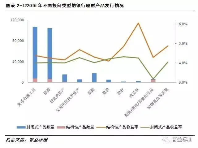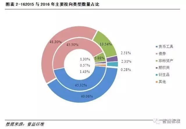 根据普益标准数据进一步整理发现,2016年银行理财产品依然主要投向货币市场工具、债券、非标三大类资产,占银行理财产品市场发行数量的94.90%,与2015年同期三大类资产数量相比,整体占比幅度下降1.8%。就三大资产内部变化而言,货币工具、债券的数量占比均出现了4-5个百分点的下降,而非标资产在数量上占比有所上升,大约上升了7.66个百分点。由此可见,尽管监管层对银行理财产品投资非标资产做了一定的限制,有效抑制了非标投资迅速膨胀可能带来的金融风险。但是在面临经济下行、股市动荡且直接投资存在限制、有效资产配置不足的投资环境下,大量银行理财产品不得不被动选择继续投资于非标类资产。