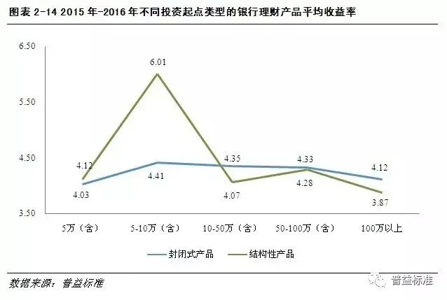 各类产品平均收益率方面,总体中值为4.36%,其中平均收益率最高的是投资起点在5-10万(含)间的结构性产品的6.01%,最低的是投资起点为100万以上的机构性产品的3.87%,平均收益率波动幅度于结构性产品内部各类型产品而言,跨度达到2.14个百分点,相比之下各类封闭式产品的平均收益率则稳定在4.03%-4.41%之间波动,内部差异较小。