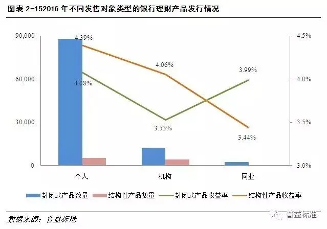 普益标准监测数据显示,2016年银行面向个人投资者累计发行93077款理财产品,所占市场比例为82.95%,其中封闭式预期收益型产品87828款,结构性产品5249款;面向机构投资者累计发行16780款理财产品,所占市场比例为14.95%,其中封闭式预期收益型产品12498款,结构性产品4282款;面向同业机构投资者累计发行2355款理财产品,所占市场比例为2.1%,其中封闭式预期收益型产品2353款,结构性产品2款。各款产品收益率方面则主要集中在3.5%-4.0%之间,且无论是封闭式预期收益型还是结构性产品内部,均为面向个人投资者产品平均收益率最高。具体到各类型中,除面向同业发行的产品外,其他两类封闭式预期收益型的平均收益率都要高于结构性产品的平均收益率。