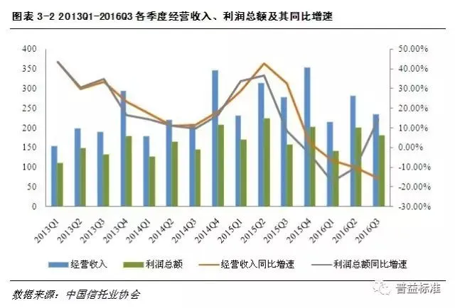 2016年,信托全行业营业收入呈负增长态势,而利润总额实现增速回升。2016年三季度末,信托全行业经营收入234.38亿元,较2015年三季度的278.08亿元,同比下降15.71%。2016年三季度信托全行业实现利润总额179.37亿元,较去年同期水平上升14.36%,成功扭转自2015年四季度以来的负增长态势。这说明在积极稳定的宏观经济背景下,信托行业利润总额有很大幅度的提升。