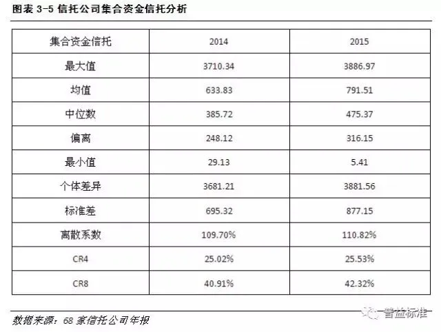 由图表3-5可知,2015年行业集合资金信托最大值为3886.97亿元,大于2014年的3710.34亿元,最小值为5.41亿元,较2014年的29.13亿元有所下降;行业集合资金信托标准差由2014年的695.32亿元上升到877.15亿元,离散系数也由109.7%扩大到110.82%,表明行业集合资金信托领域两极分化的程度正在加深。