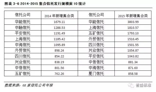 分析信托公司发行集合资金信托产品的历史情况可知,各家信托公司新增集合类产品的规模逐年增加,行业集中度也不断增强。图表3-6显示了2014年和2015年信托全行业发行集合资金产品前10名的情况。2014年,全行业共68家信托公司新增的集合资金信托产品规模为2.30万亿元,其中CR10达到46.04%;2015年,新发行集合资金信托产品3.21万亿元,CR10则升至47.21%,发行规模靠前的公司市场份额稳中有升。