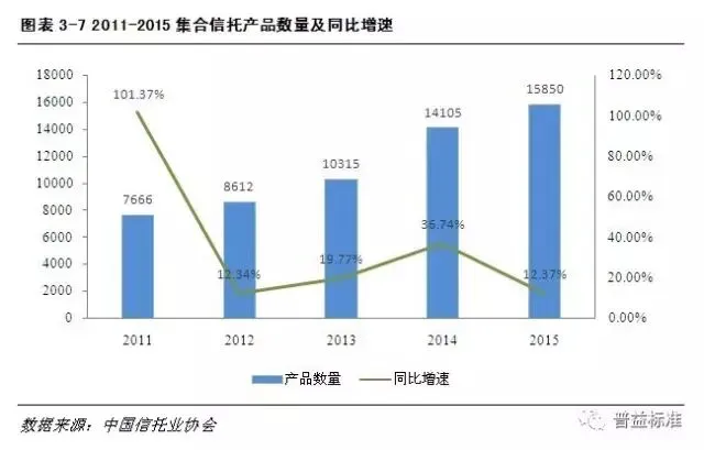 截至2015年末,行业集合资金信托产品数量达到15850个,增速为12.37%,较2014年增速下降明显。2011年至2015年间,虽然集合信托产品数量逐年上升,但增速却持续放缓。