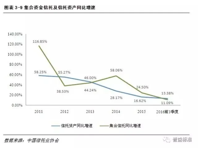 2011年至2015年集合资金信托产品存量规模也呈现出逐年上升但增速下降的趋势。截至2015年末,信托行业集合资金信托规模为5.34万亿元,同比增长24.5%,增速较2014年的58.06%出现大幅下降,2016年前两季度增速也一直低于信托资产规模的增速,三季度行业集合资金信托规模同比增速升至20%,终于超过同时期全行业信托资产规模的增速。