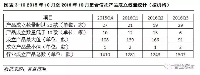 在成立集合信托产品的48家信托公司中,2015年10月至2016年10月成立产品数超过100款的有20家,成立产品数低于50款的有13家,成立规模最大的信托公司共成立了集合信托产品485款,成立规模最小的信托公司仅成立了14款集合信托产品。