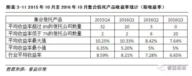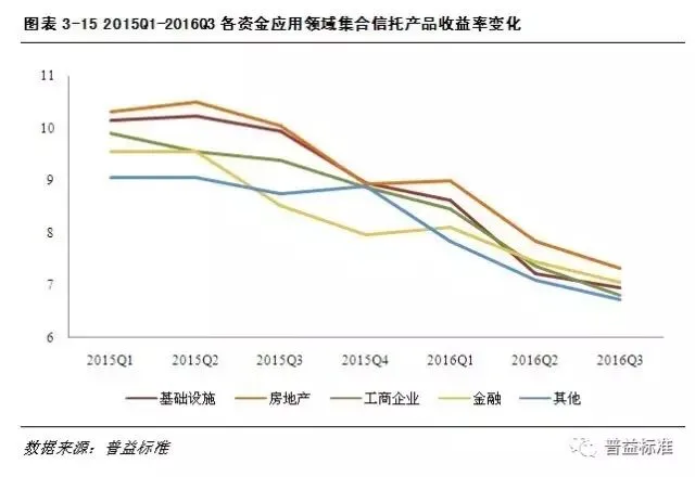 2015年10月至2016年10月间成立的集合信托产品平均收益率为7.77%,其中平均收益率超过8%的信托公司有15家,平均收益率低于7%的有5家,平均收益率最高值为10.25%,最低值为5.48%。这期间内集合信托产品平均收益率逐步下滑,2015年四季度平均收益率为8.59%,2016年一季度平均收益率下滑至8.21%,2016年二季度平均收益率跌至 8%以下,为7.28%,2016年三季度跌破7%大关,降至6.65%。2016前三季度平均收益率的同比降幅也逐渐增加,分别为17.3%、25.12%、27.9%。