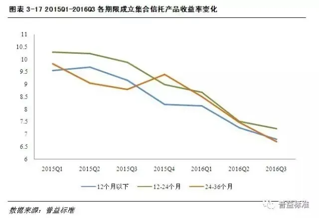2015年10月至2016年10月成立的各期限类型产品,收益率除未披露类型外,都一直处于下降区间内,且同比降幅也逐渐扩大。