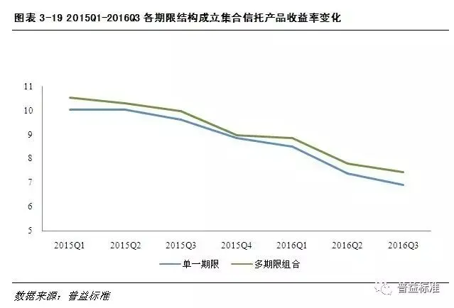 产品数量方面,二季度和前两个季度相比,降低幅度较大。在2016年三季度,之前减少的趋势逐渐止住,出现了较大幅度的增加。收益率方面,各类产品预期收益率的下降已经成为趋势,其中期限在1年以上的产品平均收益率下降60BP左右。