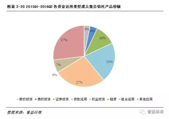 2015年10月至2016年10月成立的集合信托产品,运用最多的是权益投资和其它方式,分别成立1544、1534款产品,占比共计54.05%。其次是用于贷款支出,共成立1203款产品,占比21.12%。排名第四的是证券投资,共成立622款产品,占比10.92%。第五是多种类型组合运用,共成立387款产品,占比6.8%。股权、债权投资相差不大,分别成立175、225款产品,占比分别为3.07%、3.95%。租赁一共成立5款产品,排在最末。